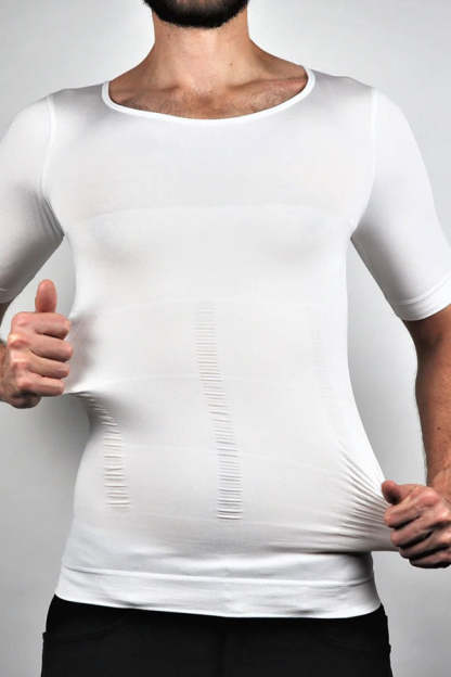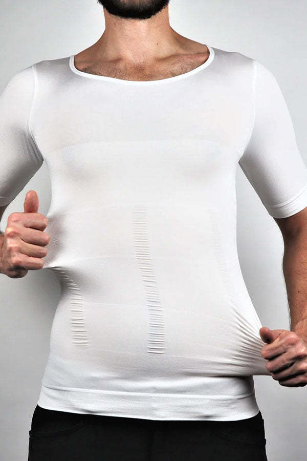 This slimming T-shirt is made using a strong weave of Nylon & Spandex. It feels tight, yet breathable and comfortable for all-day wear. Great to wear under any shirt for all occasions.